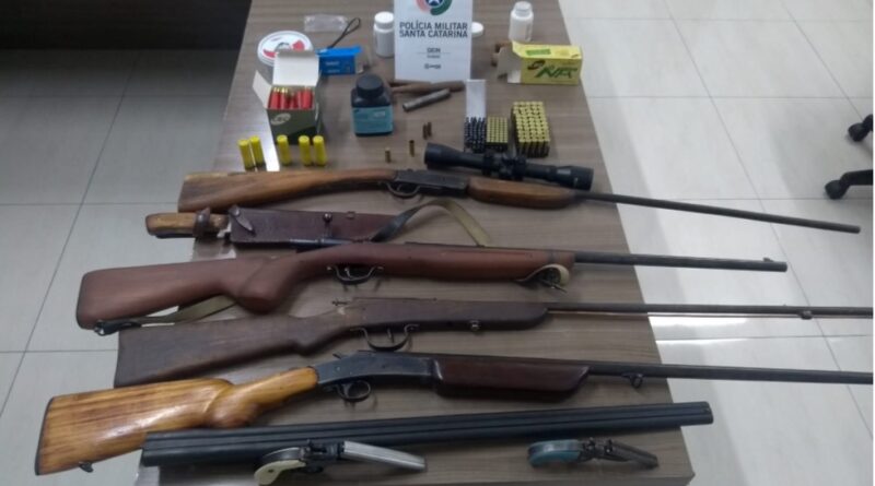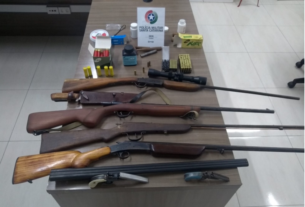 Com o local aparentemente seguro, a vítima entrou na residência e informou que as armas estavam escondidas em uma repartição de madeira, em um fundo falso, na parte superior do closet. Foi aberto esse fundo falso, e no seu interior foram localizados localizado os seguintes materiais apreendidos: